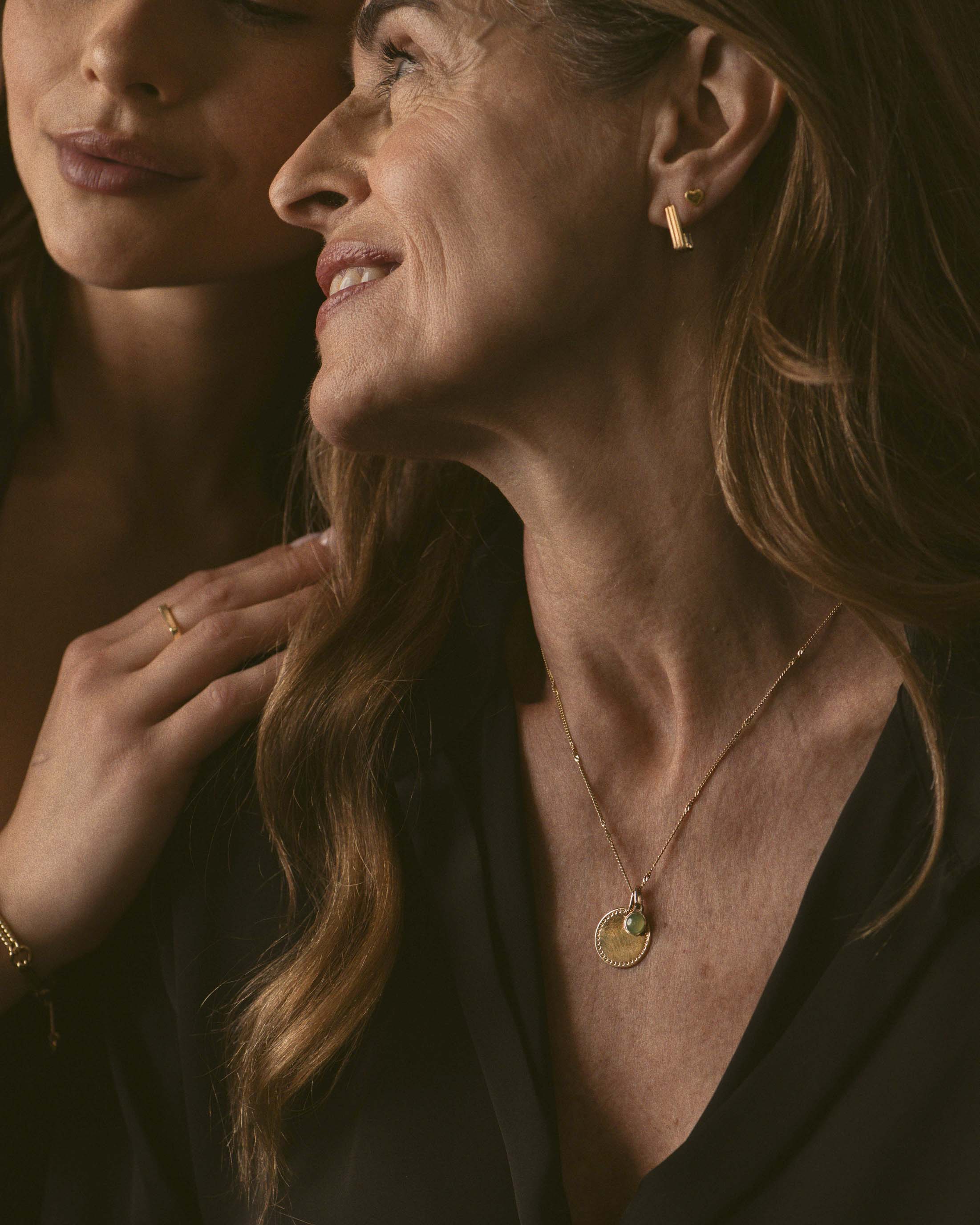 Pampille au design classique, composée d'une petite pierre de calcédoine verte, pierre de naissance du mois de mai, insérée dans un cabochon au contour lisse en plaqué or.